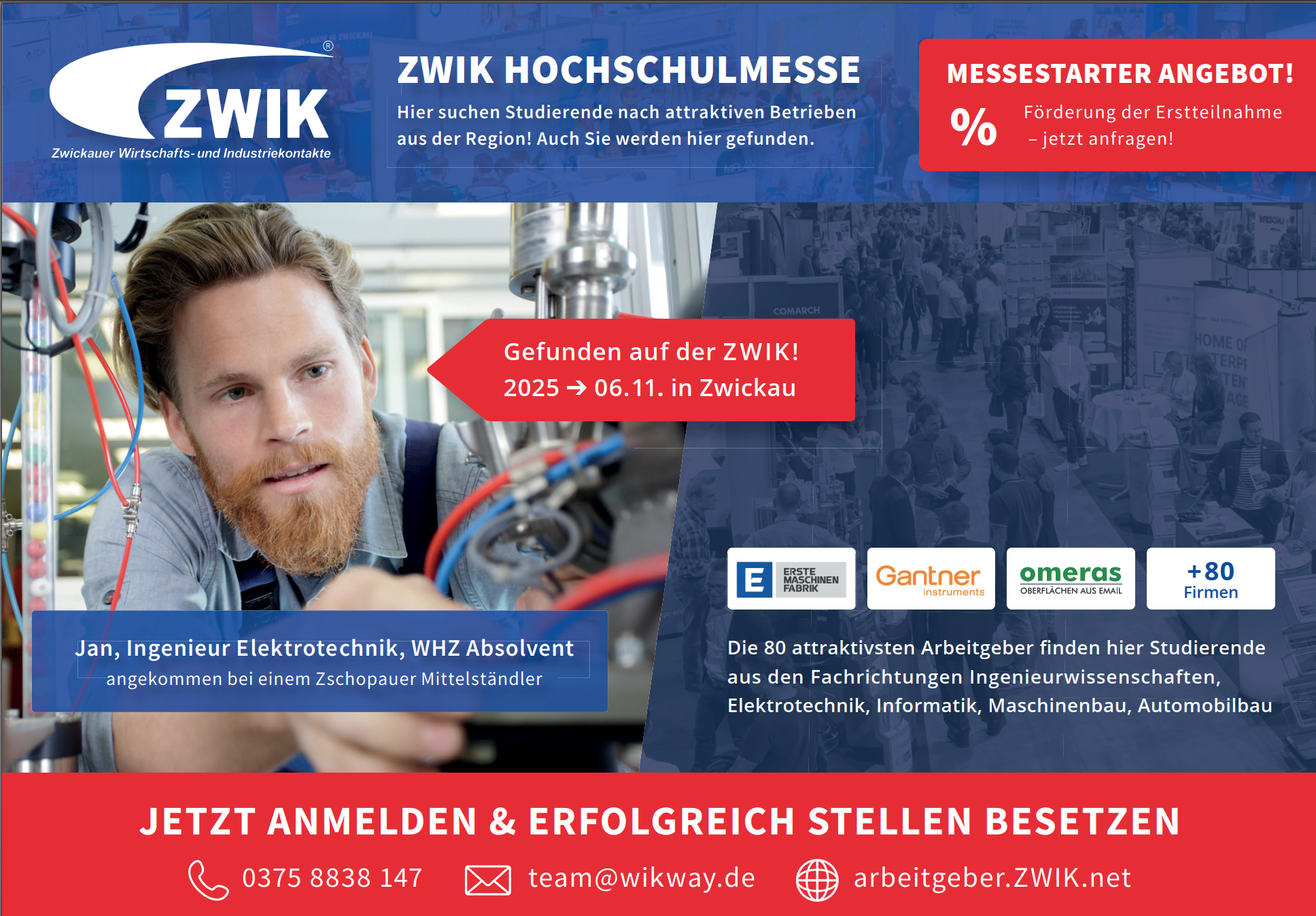 Die Teilnahme an der Jobmesse ZWIK bietet für mittelständische Unternehmen trotz Budgetrestriktionen eine kosteneffiziente und strategische Möglichkeit, qualifizierte Fachkräfte zu gewinnen und sich im Wettbewerb um Talente optimal zu positionieren. In einer Zeit, in der große Unternehmen zurückhaltend sind, können Mittelständler ihre Chance nutzen, um gezielt auf sich aufmerksam zu machen und ihre Arbeitgebermarke zu stärken.